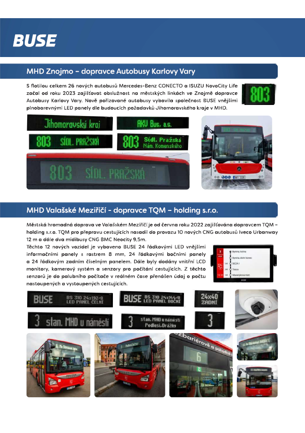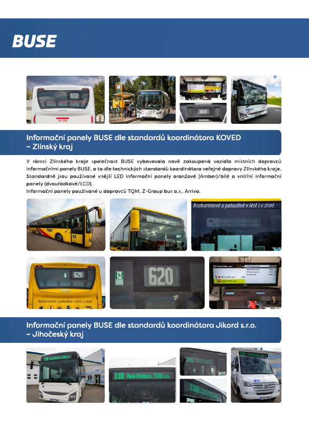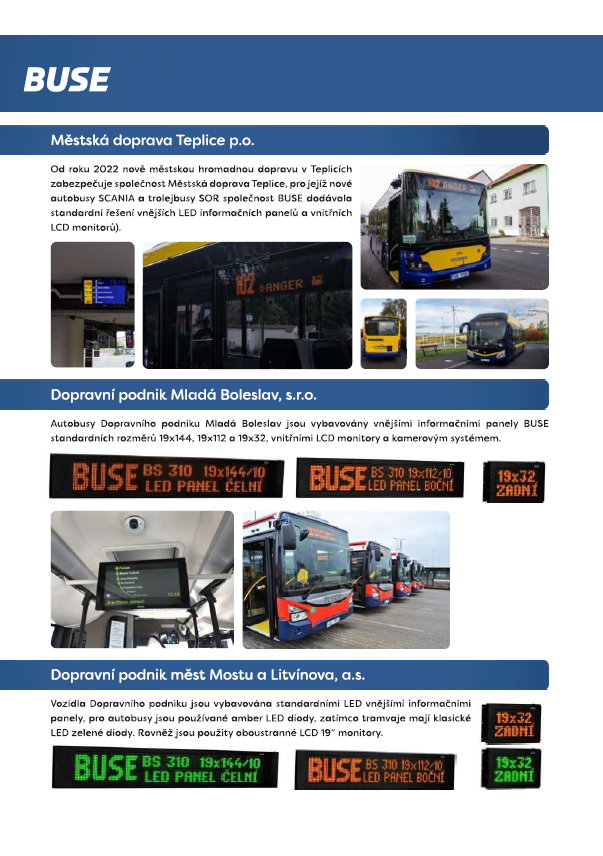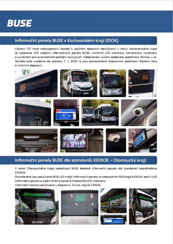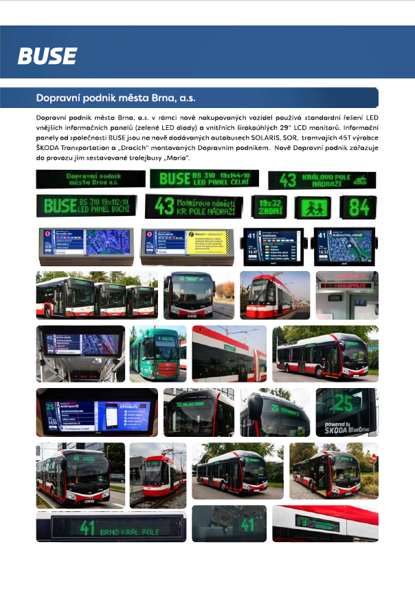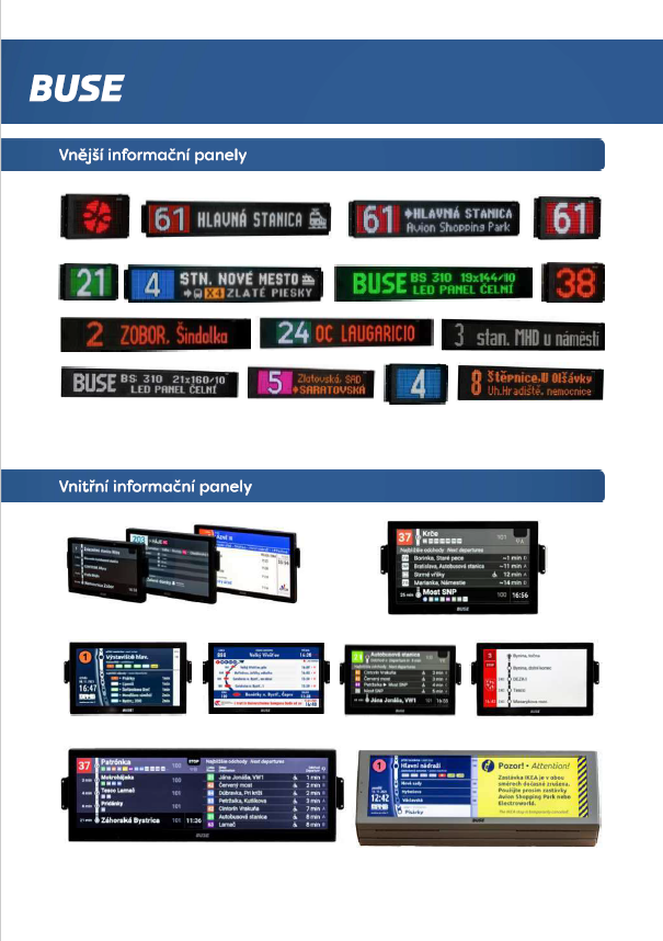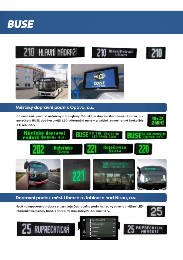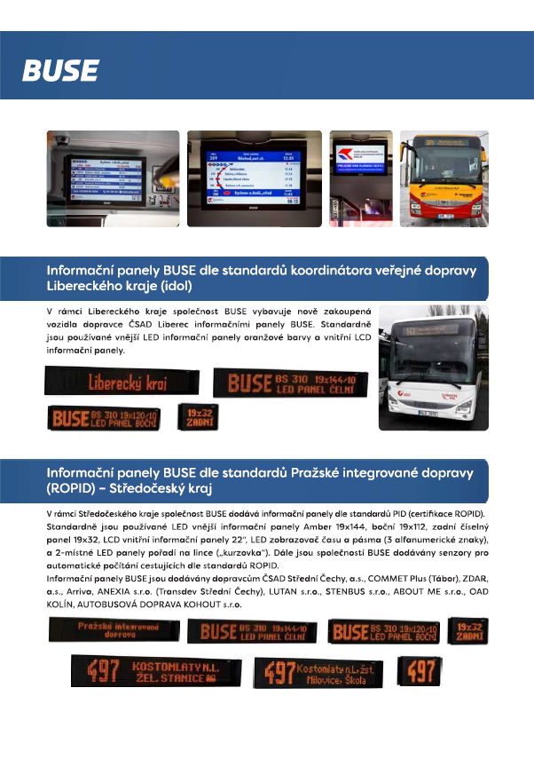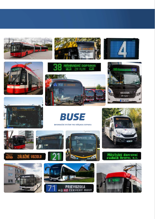 Energeticky úsporné terčíkové DOT-LED informační panely, LED monochromatické a plnobarevné panely, vnitřní LCD panely a akustické hlášení zastávek firmy BUSE spolehlivě cestujícím poskytují informace o jejich cestování veřejnou dopravou. Centra řízení dopravy mají díky BUSE systémům okamžitý přehled o poloze a stavu vozidel a k dalšímu rozvoji přepravy využívají údaje shromážděné ve vozech se systémy firmy BUSE.