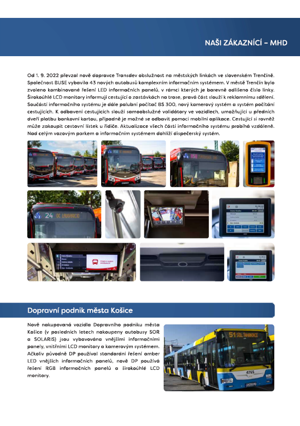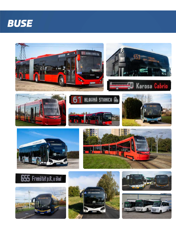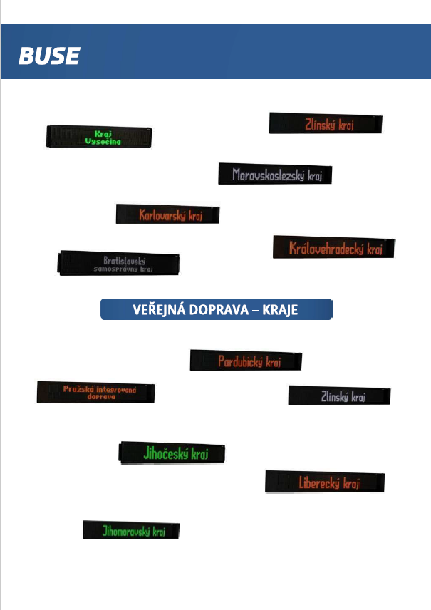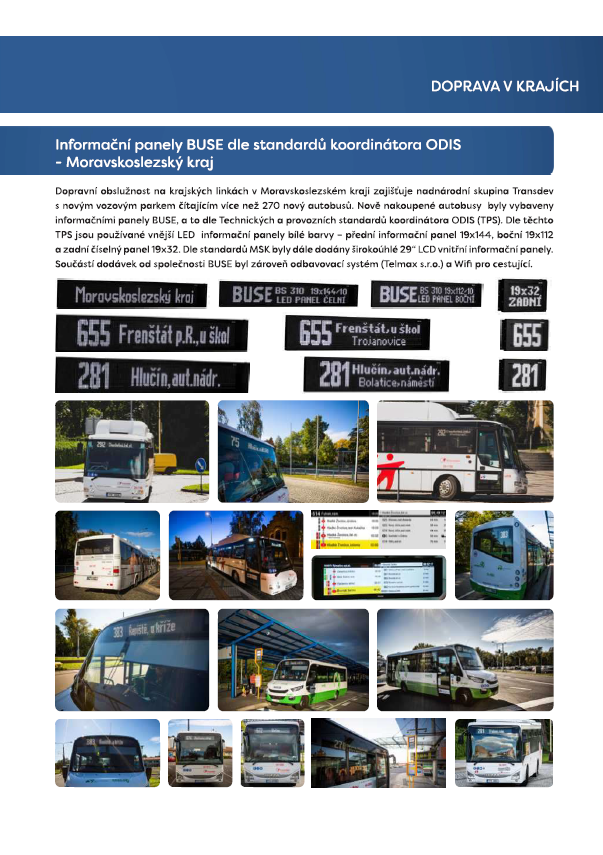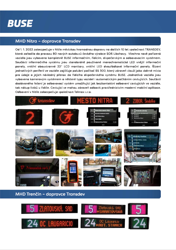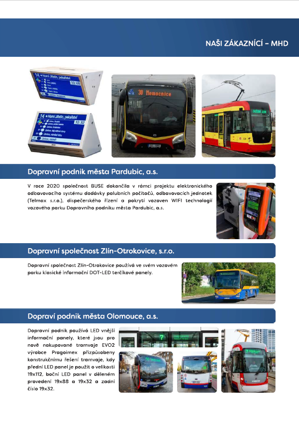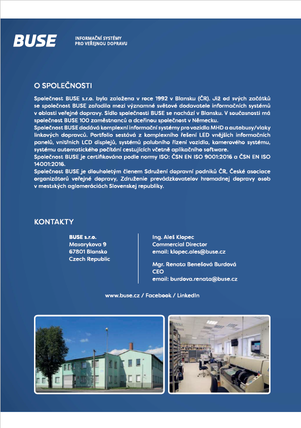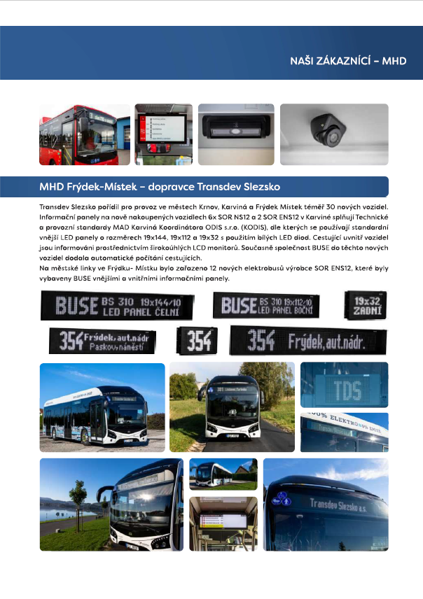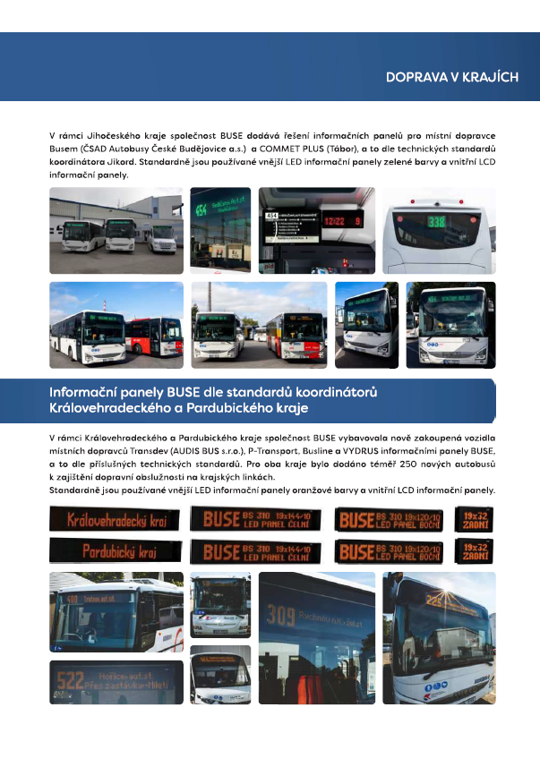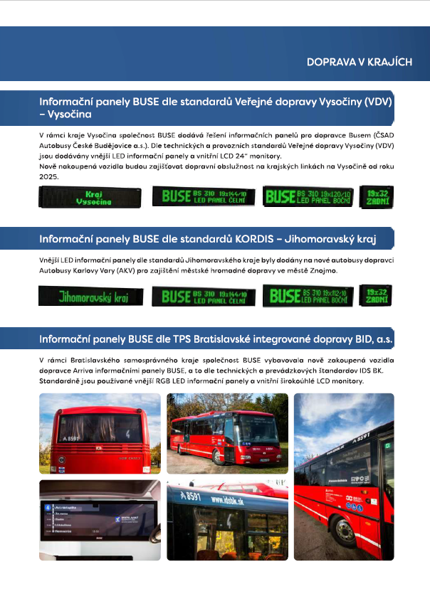 Energeticky úsporné terčíkové DOT-LED informační panely, LED monochromatické a plnobarevné panely, vnitřní LCD panely a akustické hlášení zastávek firmy BUSE spolehlivě cestujícím poskytují informace o jejich cestování veřejnou dopravou. Centra řízení dopravy mají díky BUSE systémům okamžitý přehled o poloze a stavu vozidel a k dalšímu rozvoji přepravy využívají údaje shromážděné ve vozech se systémy firmy BUSE.