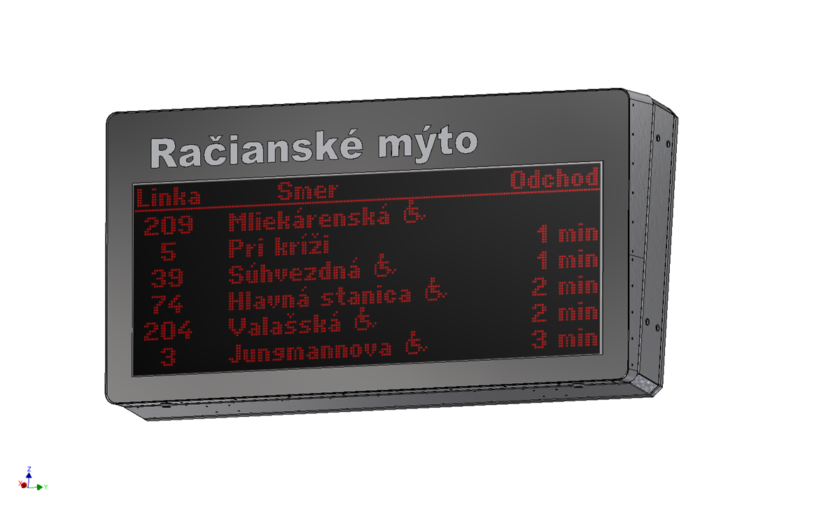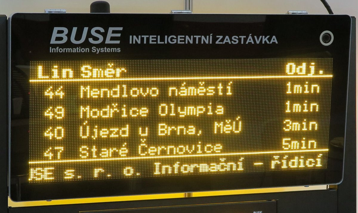 The display area of the sign is formed by a full LED matrix using power effective LED elements with an automatic brightness regulation ensuring good readability even in direct sunlight. The acoustic system clearly reproduces the content of the sign and messages received from the control centre. The sign gets connected by means of in-built communication devices (mobile operator network, RDST, Wi-Fi, LAN) to the data centre, where it reads real-time information related to next departures and receives text and special acoustic messages. If connected with the data centre, the sign displays off-line information according to the saved timetable and real-time information from GPS. The in-built communication unit provides passengers waiting at the bus stop with Wi-Fi access to the Internet. Software equipment supplied with the sign provides remote administration and a camera view.