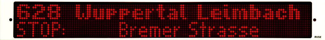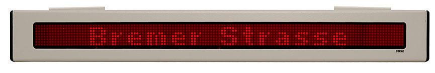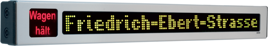 BUSE’s LED Interior signs typically display next, current stop and destination, line or connection number, time, zone, stop at request, graphic symbol and special information for example from the control centre. To highlight the information, the scrolling text or text insert functions are available. BUSE offers single purpose time and zone displays adapted to local transport system requirements. Use: buses, trolleybuses, trams, trains and for advertisement. Options available: